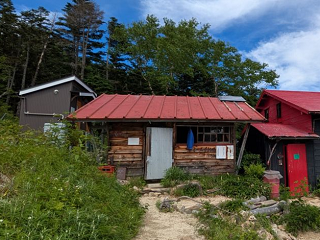 越百山の麓に越百小屋がある。黒い壁と赤い屋根、赤いドアの建物が越百小屋で民間で運営され、6月から10月の間に営業している。その左隣にあるのが越百山避難小屋で大桑村の施設だ。更にその左にあるトイレも同様に大桑村の施設となっている。