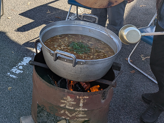 分館にある大鍋を使って里芋汁が作られました。豚汁と鶏汁の2つが調理され、こども達と一緒に握ったおにぎりと楽しみました。鍋の火も薪を使うことで、災害時の対応力を高める、美味しい訓練となりました。青空の下、皆で味わうおにぎりと芋汁は最高でした。